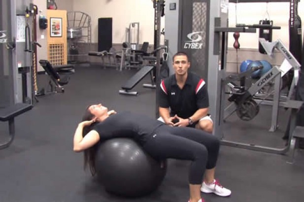 平躺在健身球上,双脚平放地上,双手放在头侧,手臂打开。下颏向胸前微收,呼气,收缩腹肌抬起上身约45度,保持2秒钟,然后慢慢回到开始姿势。为了保持平衡,两脚可以多分开些。如果增加难度,可以将双脚并起来做。