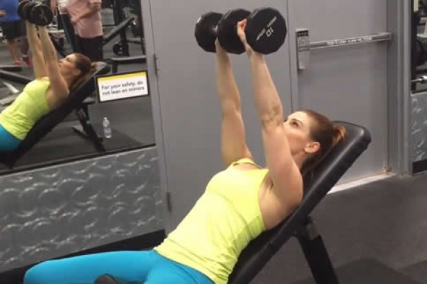 双腿打开仰卧在长凳上,此时我们双手各握一只哑铃放在我们的胸前位置。当我们身体状态调整好之后,我们双手平行向上推举,直到我们的手臂伸直,再将手臂收回,重新开始动作。每一次坚持完成20~30个左右,一次完成三组,每组间隔可以为60秒。注意椅子的斜度最好是在45度到60度之间最佳。