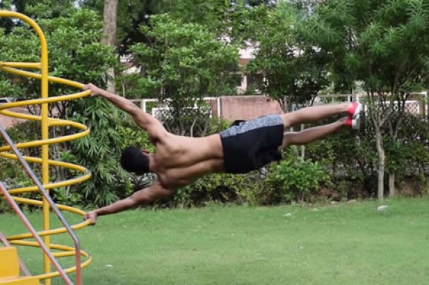 想要练成人体旗帜,我们就要从最开始的力量训练做起,那么我们可以先做引体向上,训练我们的手臂力量,而后开始对我们的平衡性进行训练,平衡性训练过程,我们需要借助一根竖立的单杠,然后双手抓杆,双脚触地,让我们的身体尽量下压。