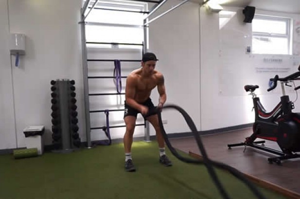(2)接着,双手抓着绳子,使用二头肌、三头肌、肱桡肌将战绳交叉用力甩动。