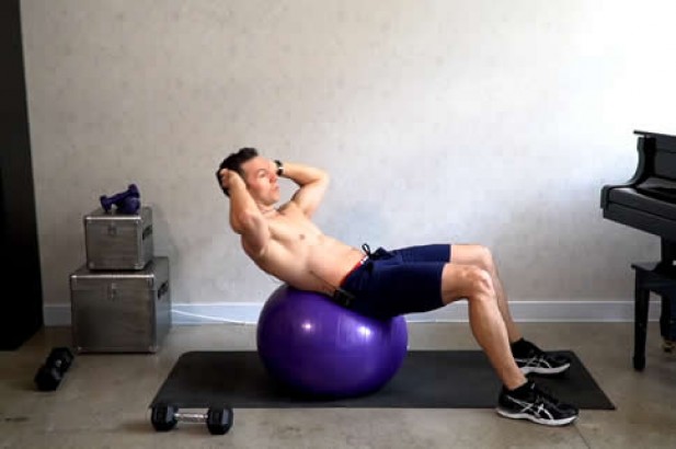 平躺在健身球上,双脚平放地上,双手放在头侧,手臂打开。下颏向胸前微收,呼气,收缩腹肌抬起上身约45度,保持2秒钟,然后慢慢回到开始姿势。为了保持平衡,两脚可以多分开些。如果增加难度,可以将双脚并起来做。