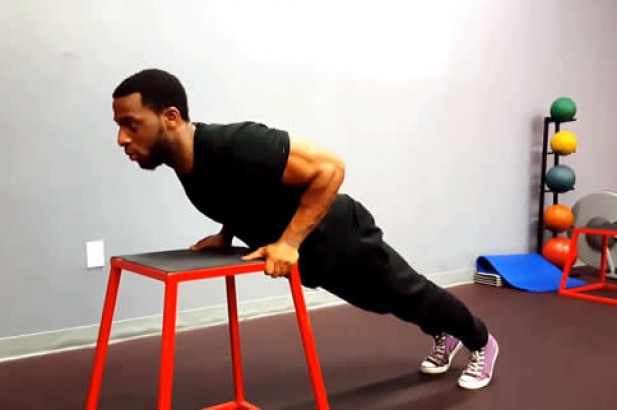 1. 面朝下俯撑在地板上,双脚放在平板凳或者稳定的台子上。身体挺直,腹部收紧,手臂伸直支撑地面,双手间距与肩同宽。这是动作的起始位置。