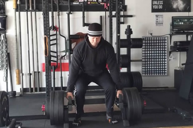 1. 将框架装载上需要的重量。将你自己置于把手中央。你的双脚应保持与胯部同宽的距离。臀部弯曲抓住杠铃,允许你的肩胛骨伸展。
