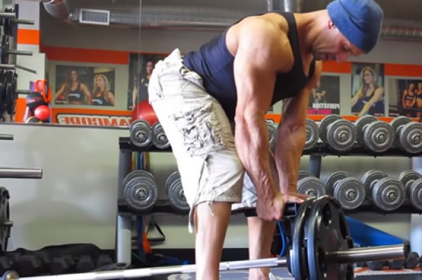 2. 收缩肩胛,手肘弯曲,将杠铃上划至胸前,同时呼气。