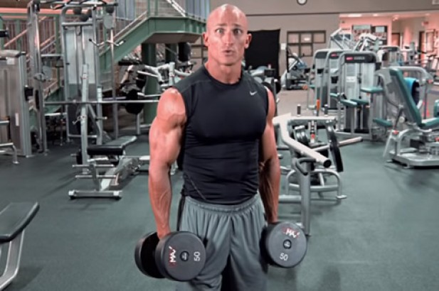 3. 然后将哑铃降回起始位置,同时吸气。