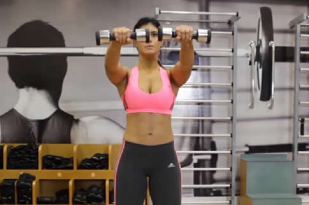3. 在顶端稍适停留,感受肩部的收缩。然后慢慢将哑铃放回起始位置,同时吸气。