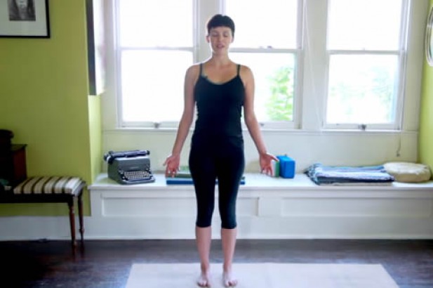 3. 呼气,双肩下沉远离双耳。