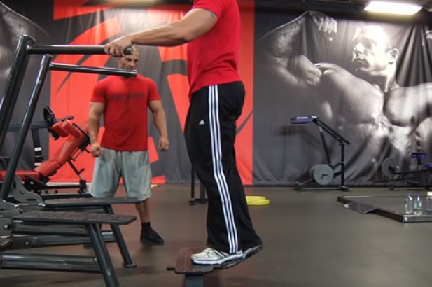 1. 双手扶着固定的物体保持身体平衡,双脚站在哑铃的把手上。建议选择圆形哑铃,这样身体需要付出更多努力来维持平衡。站稳之后,让脚后跟尽量向下,哑铃同时向前滚动,以此充分拉伸小腿。这是动作的起始位置。
