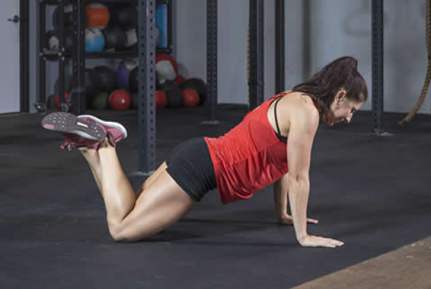 2.慢慢下蹲,直到双手接触地面。双手撑在地面,双腿向后蹬直。然后屈肘,身体向下再上升,做一个普通俯卧撑。