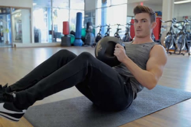 做法:背部着地平躺在毯子上,并拢双腿、抬起,稍微弯曲膝盖;双手托住一个排球,将排球由大腿处开始慢慢向上推,同时自然地向上抬起上身;等到排球被推至小腿处的时候,保持姿势2秒钟,然后让球再滚回大腿部位,同时上身回到了原位,如此重复上述动作。练习过程中眼睛是始终盯住球的。
