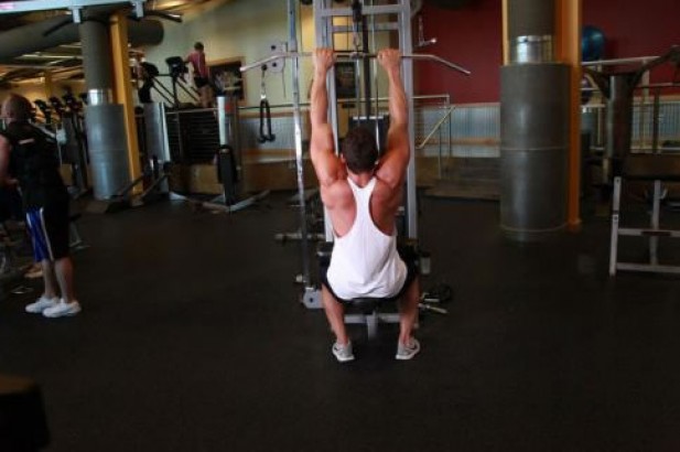 这个动作需要借助器械完成,一开始我们坐在器械的凳子上,让我们身体坐直,挺胸收腹,此时我们双手握住器械的把手,注意双手的距离比我们的肩部要更宽一些。这时候我们调整好呼吸,让我们双手发力,将重物用力往我们的身体下方拉下,注意这时候胸部也是需要发力的,且我们将重物下拉过程中,我们的胸部是扩张的。