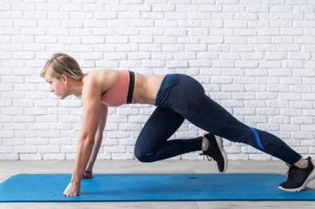 双手撑地,然后张开略比肩宽的距离;双脚向后伸直,并以脚尖着地。轮流提高左、右的膝盖去触碰手肘,留意膝盖是往身体外侧伸展。一分钟内不断重覆整套动作。
