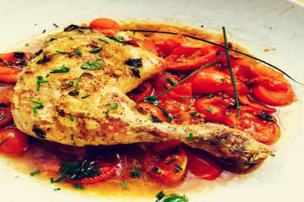 鸡腿两个、番茄一颗、大蒜一颗、香叶两片、橄榄油少许、香葱少许、盐少许、胡椒少许。