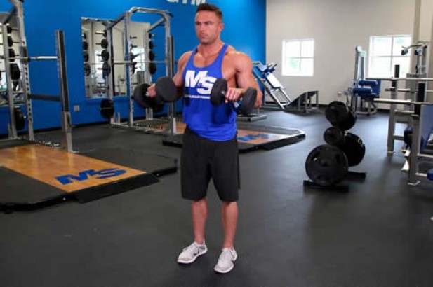 首先自然站立,全身放松,双手持哑铃放于身体两侧,上臂贴着身体向上弯举,然后缓慢向下还原,保持挺胸抬头,收紧核心动作需要重复两组,每组12次,每组动作间歇15秒。