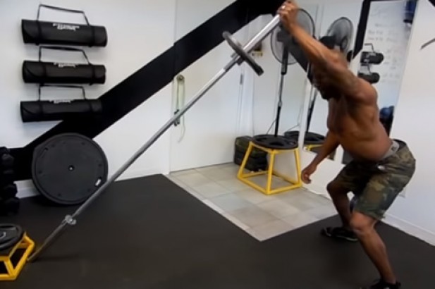 这个动作可以很好的锻炼你的肩部肌群和发展完整的肩肱节律。把杠铃的一端固定在地面卡槽中。跪姿然后拉起杠铃,手肘弯曲,将手臂收紧在身体侧边,抓住杠铃前端。手臂固定,三角肌收缩发力向侧上方推起,直到手臂伸直和身体呈一个Y形。放下时候,让上手臂往躯干收即可。动作过程中注意保持躯干的稳定,核心收紧。