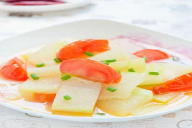 原料:冬瓜500克、番茄2个、姜丝5克、食盐适量,葱花随个人嗜好。
