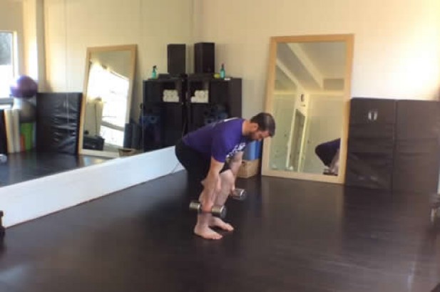双脚自然分立与肩膀同宽,上半身前倾60°C左右,膝盖微曲,双手握哑铃,垂放在膝盖前方。