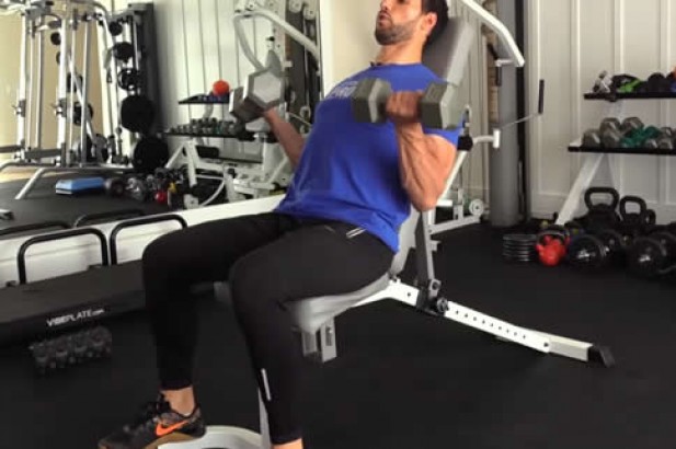 身体保持坐姿在斜凳上,身体背部紧靠住斜凳面,双手各持哑铃放在身体的两侧,双臂的肘部紧靠住身体的上半身,双手掌心相对,握住杠铃的中间位置。运动时保持身体的稳定,双肩向下沉,保持不动,使双臂的肱二头肌向内收缩,前臂向上举起同时旋转手臂,使手掌心朝后,当哑铃到达肩部的时候,保持动作顶峰收缩1秒,然后慢慢放下哑铃旋转手臂回到原来位置,手掌心相对。重复动作再次进行。