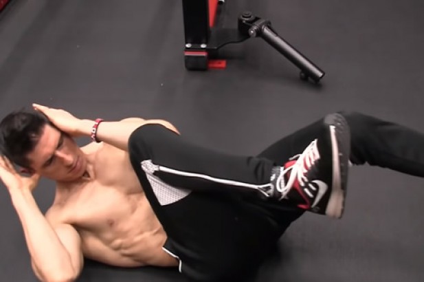 1、仰卧在垫子上,双手放在脑后。收紧腹部,将你的上半身稍微抬起离开地面。