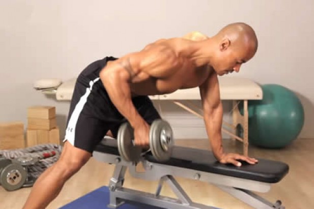 1. 一开始先将长椅调整至水平或是稍有斜度,面对长椅趴下,双手伸直握住哑铃。