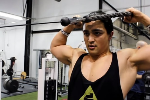 2、 当开始拉动时,向后收紧双肩后束,注意在这个过程中可以做一个肩部外旋的动作,在顶峰收缩位置手臂和肩部的形态应该如同正展二头的一样。