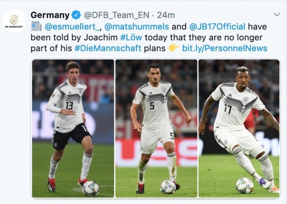 “2019年是德国足球新的开始,我们希望继续我们去年年底的新老交替。博阿滕、胡梅尔斯和穆勒将不再进入德国国家队。我在今天向拜仁慕尼黑高层和球员解释了我的考虑和计划。他们都会继续处于世界级水平,在俱乐部是成功的保证。他们是伟大的球员,带领德国队取得成功,为德国队做了突出的贡献。我感谢胡梅尔斯、博阿滕和穆勒一起度过的成功、出色、无与伦比的几年。”