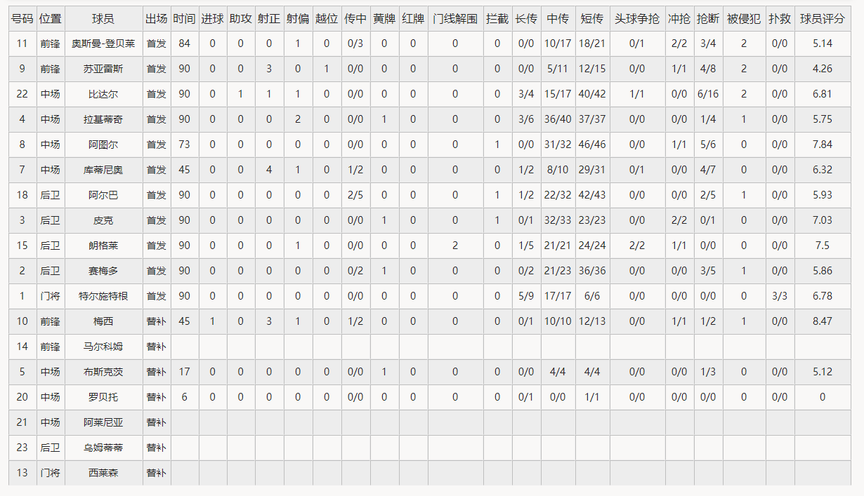 巴塞罗那(4-3-3):1-特尔施特根/2-塞梅多、3-皮克、15-朗格莱、18-阿尔巴/22-比达尔、4-拉基蒂奇、8-阿图尔(73’5-布斯克茨)/11-登贝莱(84’20-塞尔吉-罗贝托)、9-苏亚雷斯、7-库蒂尼奥(46’10-梅西)