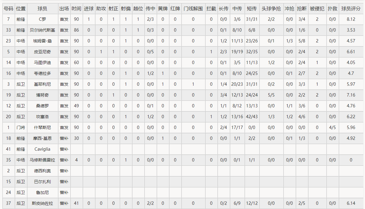 尤文图斯(4-3-3):1-什琴斯尼/3-基耶利尼、19-博努奇、20-坎塞洛、12-阿莱士-桑德罗(37-斯皮纳佐拉 49’)/14-马图伊迪(18-莫伊塞-基恩 60’)、5-皮亚尼奇、23-埃姆雷-詹/16-夸德拉多、33-贝尔纳代斯基(35-马特乌斯-佩雷拉 85’)、7-C罗
