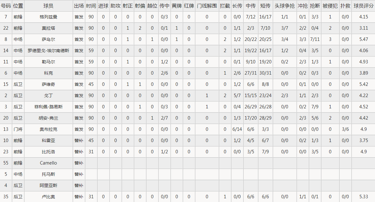 马德里竞技(4-4-2):13-奥布拉克、3-菲利佩、2-戈丁、15-萨维奇(46’科雷亚)、20-胡安弗兰、11-勒马尔(59’比托洛)、8-萨乌尔、14-罗德里(59’蒙特罗)、6-科克、7-格列兹曼、22-莫拉塔