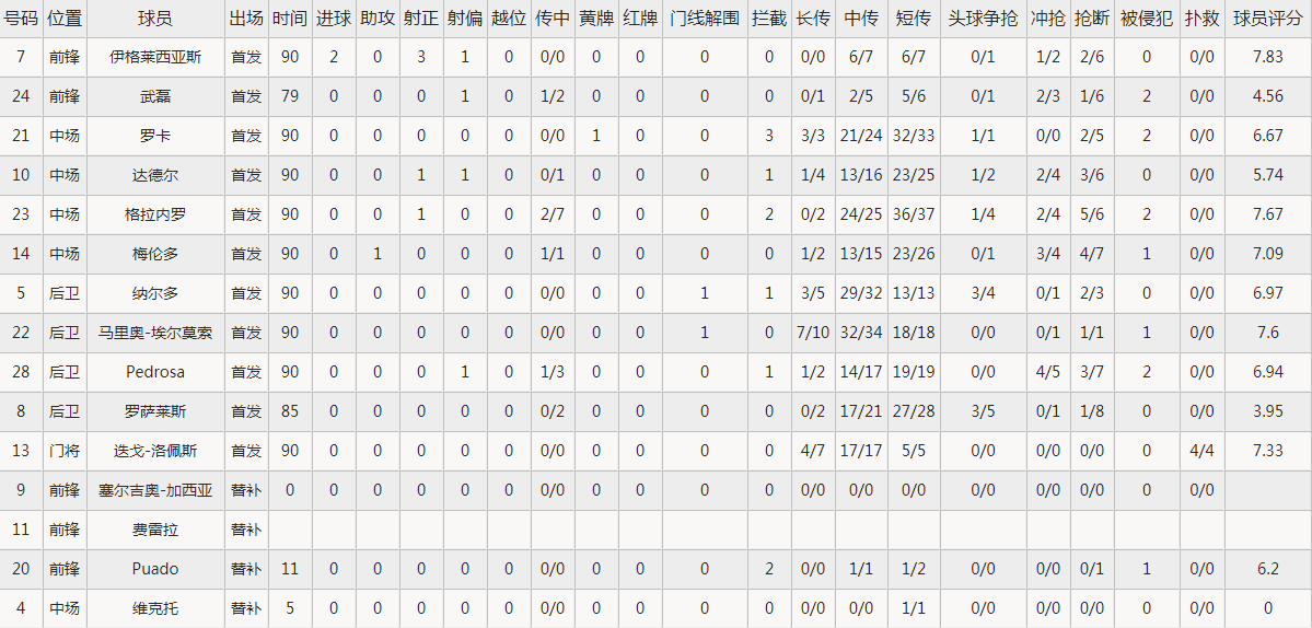 西班牙人(4-3-3):13-迭戈-洛佩斯、8-罗萨莱斯(85’维克托-桑切斯)、5-纳尔多、22-埃尔莫索、28-佩德罗萨、23-格拉内罗、21-罗卡、10-达德尔、14-梅伦多(91’塞尔吉奥-加西亚)、24-武磊(78’普阿多)、7-伊格莱西亚斯