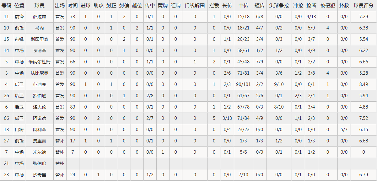 利物浦(4-3-3):1-阿利森/26-罗伯逊、6-洛夫伦(7-米尔纳 84’)、4-范迪克、66-阿诺德/14-亨德森、5-维纳尔杜姆(23-沙奇里 66’)、3-法比尼奥/10-马内、15-斯图里奇、11-萨拉赫(27-奥里吉 73’)