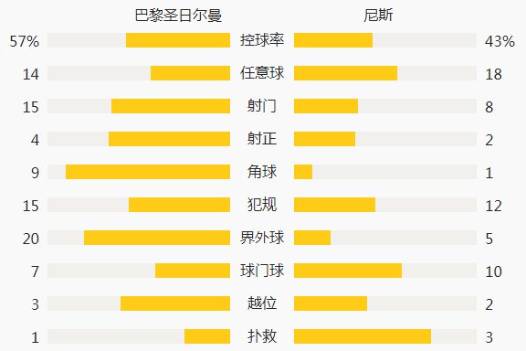 此后,双方均无建树。全场比赛结束,巴黎主场1-1战平尼斯。