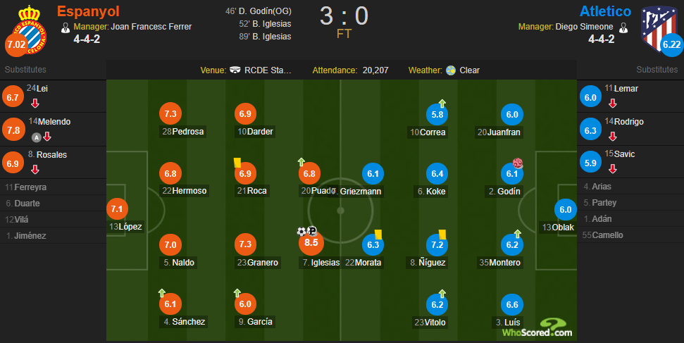 在另一家专业足球媒体“WhoScored”的赛后评分中,武磊也得到6.7分,不幸成为西班牙人首发11人中的最低分。本场完成梅开二度的伊格莱西亚斯获得了全场最高的8.6分,为他送出助攻的梅伦多得到7.8分。马竞方面,只有萨乌尔的得分超过7.0分,打进乌龙的戈丁得到6.1分,几乎全场隐形的格列兹曼也只得到6.1分。