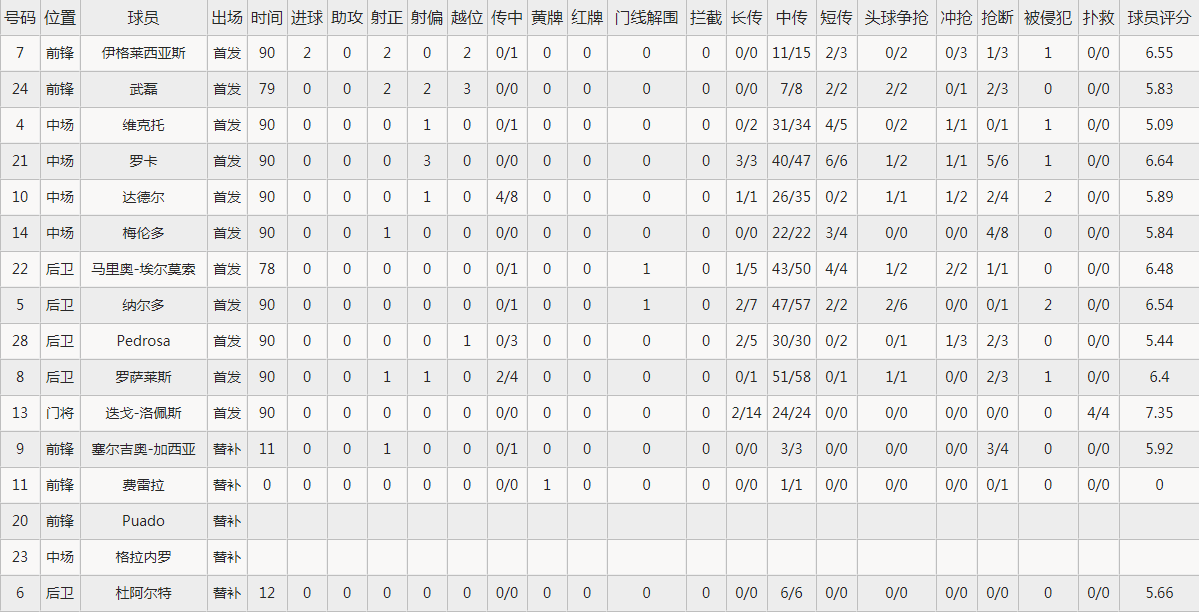西班牙人(4-4-2):13-迭戈-洛佩斯、8-罗萨莱斯、5-纳尔多、22-埃尔莫索(79’杜阿尔特)、28-佩德罗萨、21-罗卡、4-维克托-桑切斯、10-达德尔、14-梅伦多、24-武磊(79’塞尔吉奥-加西亚)、7-伊格莱西亚斯(90’费雷拉)