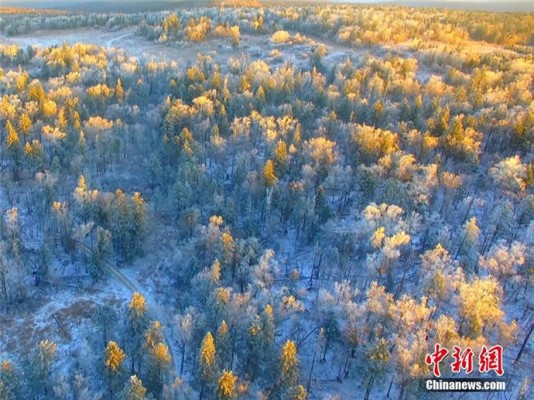 10月30日清晨,吉林延边仙峰国家森林公园雪岭景区出现大面积雾凇景观。正逢秋季,景区本是一派黄橙橙的景象,但一夜之间仿佛披上了一件洁白的薄纱。尽管此次雾凇没能完全覆盖森林,但这反而让金黄的树叶、苍翠的青松与洁白的冰花相映成趣,鸟瞰之下,整座山也晶莹剔透起来。
