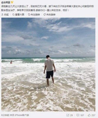 “很抱歉这几天让大家担心了,目前我已无大碍,接下来的日子我会带着大家的关心和鼓励积极配合医生治疗,争取早日回到赛场.感谢你们一直以来的支持,祝好!”丛明晨在社交媒体上写道。