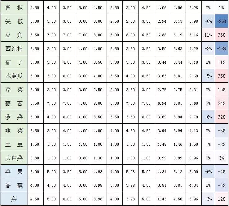 粮油、蔬菜、副食品零售价格基本稳定。其中:一、猪肉、鸡蛋价格环比小幅下降,牛羊肉价格基本平稳,鸡肉价格小幅上涨。二、个别蔬菜价格微幅上涨。三、粮油价格持续稳定。四、水果价格小幅下降。