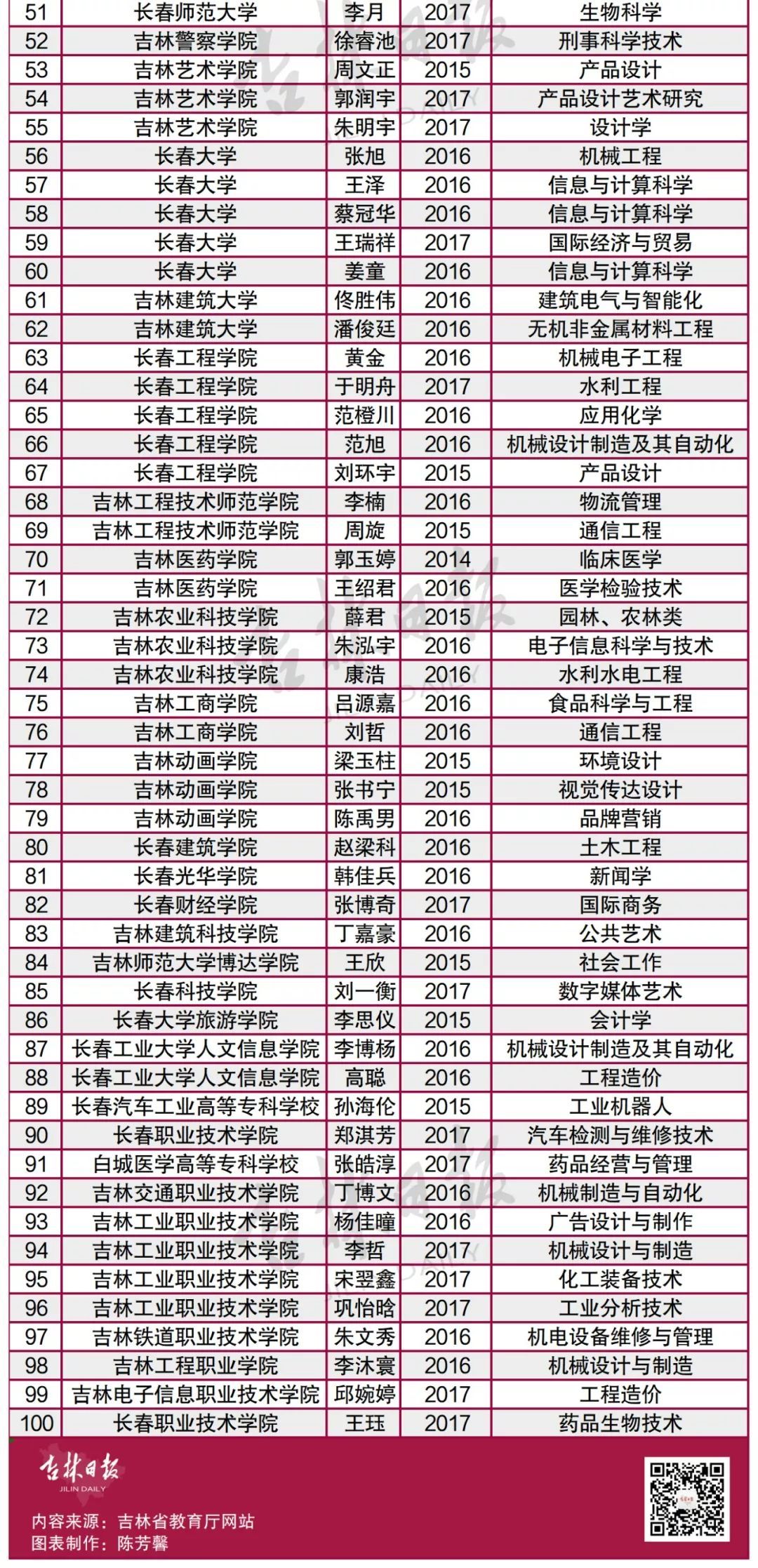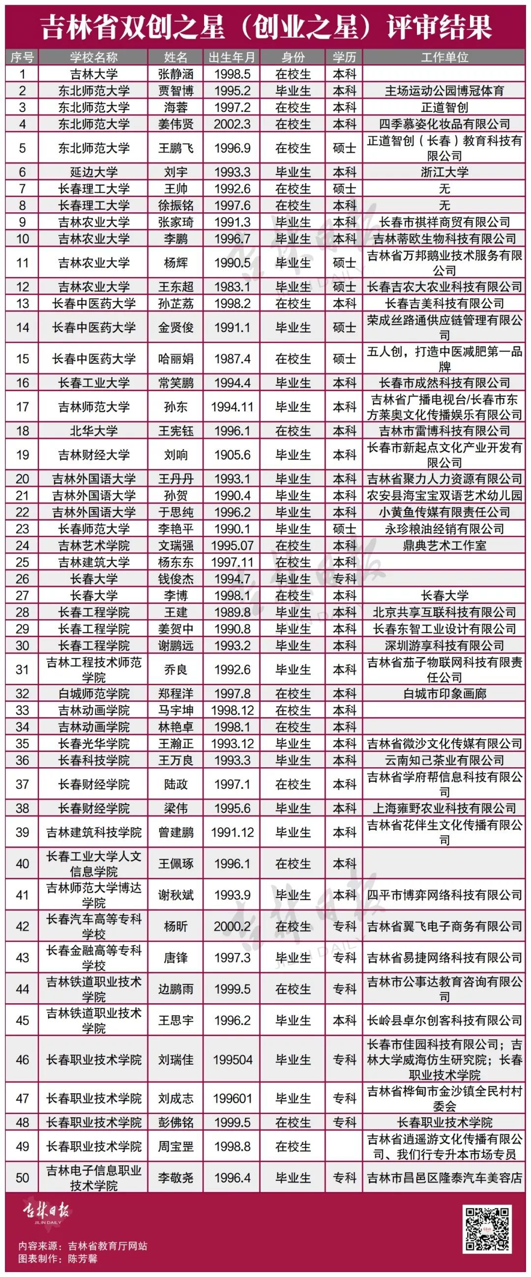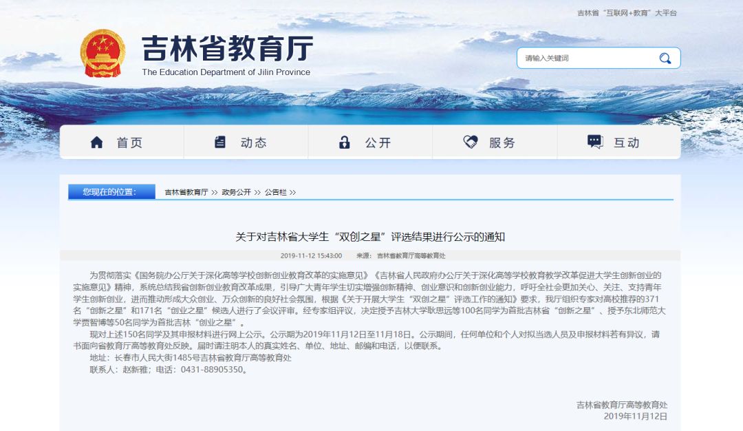 12日,吉林省教育厅网站发布了《关于对吉林省大学生“双创之星”评选结果进行公示的通知》。根据相关要求,经专家组评议,决定授予100名同学为首批吉林省“创新之星”、授予50名同学为首批吉林“创业之星”。公示期为2019年11月12日至11月18日。