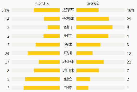 第26分钟,赫塔费左路传中,安赫尔-罗德里格斯后点面对半空门右脚推射,皮球被防守球员倒地挡出,阿兰巴里弧顶处补射高出横梁。第30分钟,海梅-马塔右路下底传中,奥利韦拉后点头球攻门,皮球被迭戈-洛佩斯没收。第38分钟,佩德罗萨左路下底传中,武磊后点头球摆渡,可惜没有队友跟进。第39分钟,维克托-戈麦斯右路传中,武磊在两名中卫之间找到空间并完成甩头攻门,可惜皮球稍稍高出横梁。