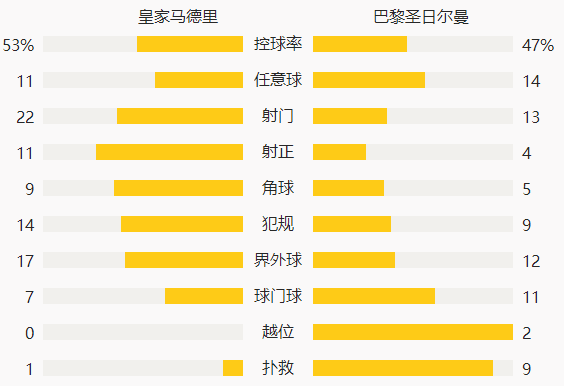 第82分钟,罗德里戈换下伊斯科,皇马用完三个换人名额。第83分钟,巴黎圣日耳曼扳平比分,德拉克斯勒禁区线上左脚打门打在后卫身上被挡,萨拉比亚左脚补射得手,2-2。
