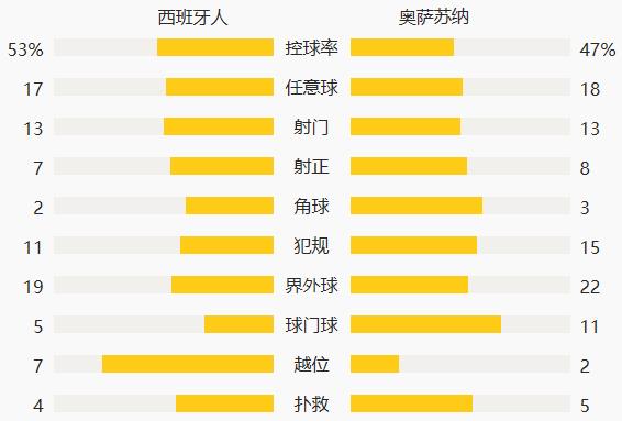 双方最近的5次交锋中,西班牙人3胜1平1负占据优势,奥萨苏纳上一次在联赛客场战胜西班牙人还是在2012年11月。阵容方面,西班牙人使用3-5-2阵型,大卫-洛佩斯、埃斯皮诺萨、卡莱罗组成三中卫,中场达德尔、格拉内罗、罗卡首发,武磊与坎普萨诺组成双前锋。奥萨苏纳排出4-4-2阵型,西班牙人旧将隆卡利亚领衔后卫线,奥耶尔与布拉沙纳茨组成双后腰,阿德里安与阿维拉搭档双前锋。
