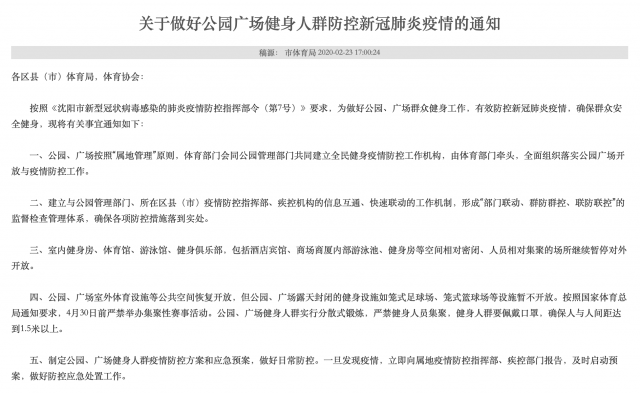近日,沈阳市发布疫情防控指挥通知,在其中的第四条中,称按照国家体育总局通知要求,4月30日前严禁举办集聚性赛事活动。而目前,该通知已经被删除。