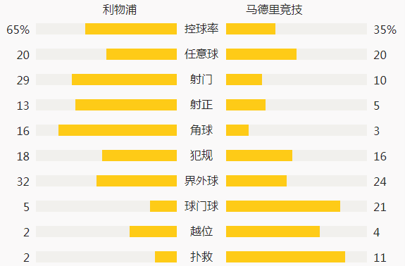 上半场结束时,利物浦凭借着维纳尔杜姆的进球,主场1-0领先马德里竞技,进入中场休息。