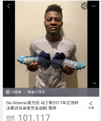 这两天,为了助力公益马丁斯也对自己2017年足协杯冠军的落场版球鞋进行拍卖。据申花队长莫雷诺的介绍,不到24小时的时间拍卖价格已经达到4万多,最终以101117元的价格成交。