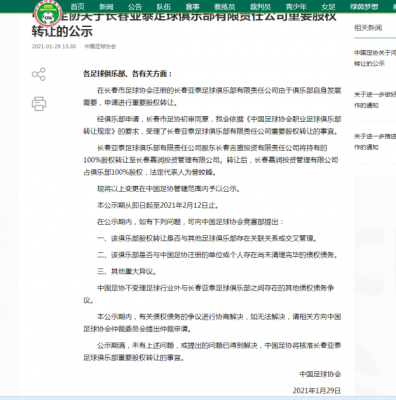 1月29日,中国足协在其官方网站上公布了《中国足协关于长春亚泰足球俱乐部有限责任公司重要股权转让的公示》,并明确表示,该公示的公示期截止日期为2月12日。