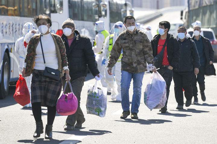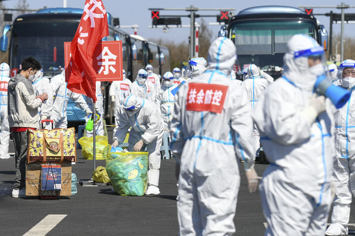 在长春高速公路东出口,返乡农民有序登车(4月12日摄)。