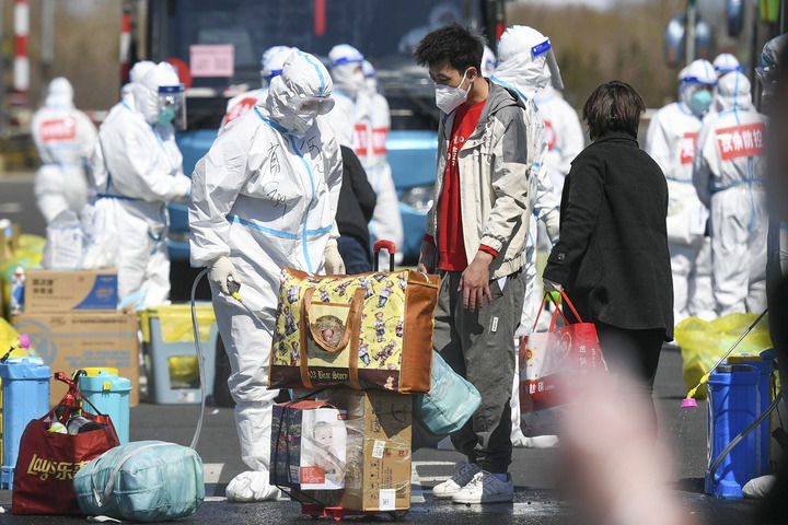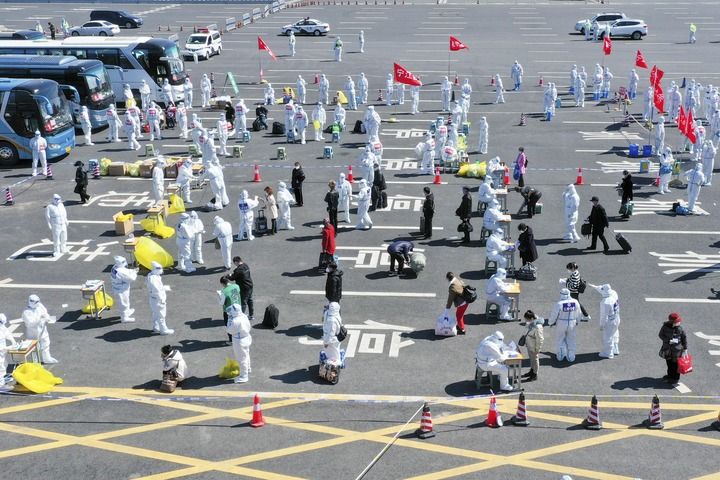 在长春高速公路东出口,返乡农民排队登车(4月12日摄)。