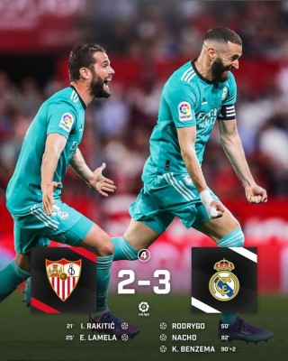 全场比赛结束,皇马在两球落后的情况下连续打入三球,最终3-2逆转塞维利亚获得了胜利。