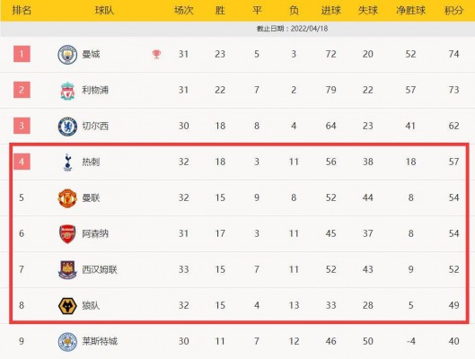 此外,排名第3的切尔西(30场积62分)与排名第8的狼队(32场积49分)本周末没有征战英超,排名第9的莱斯特城(30场积40分)随着本轮客场1-2不敌纽卡斯尔,基本上已经退出了英超的争四之战。