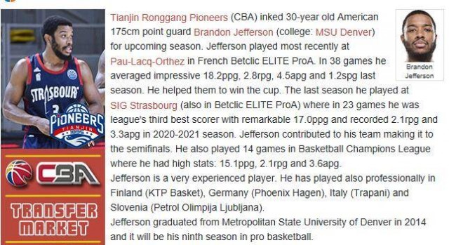 上个赛季拥有罗切斯特和伯顿两名小外援的天津队并不被外界看好,但最终在主帅张德贵的带领下成为最大黑马,历史上第二次杀进季后赛。布兰登-杰弗森的加盟可能预示着罗切斯特和伯顿之中至少有一人不会出现在天津队下赛季的阵容中。